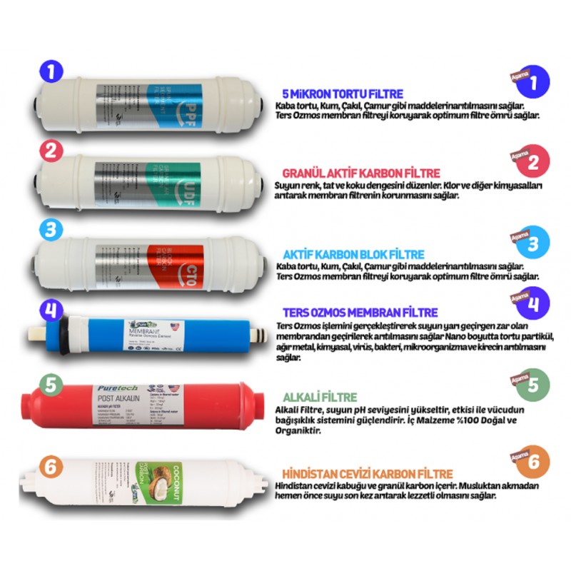 4 | Ters Ozmos Membran Filtre | Ters ozmos işlemini gerçekleştirerek suyun yarı geçirgen zar olan membrandan geçirilerek arıtılmasını sağlar. Nano boyutta tortu partikül, ağır metal, kimyasal, virüs, bakteri, mikroorganizma ve kirecin arıtılmasını sağlar. |